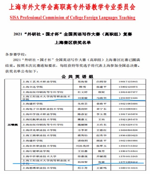 11月3日,2021年“外研社•国才杯”全国英语写作大赛(高职组)复赛传来喜讯,高职学院杨琛智、刘姜骏同学获得上海市复赛第三名的好成绩。