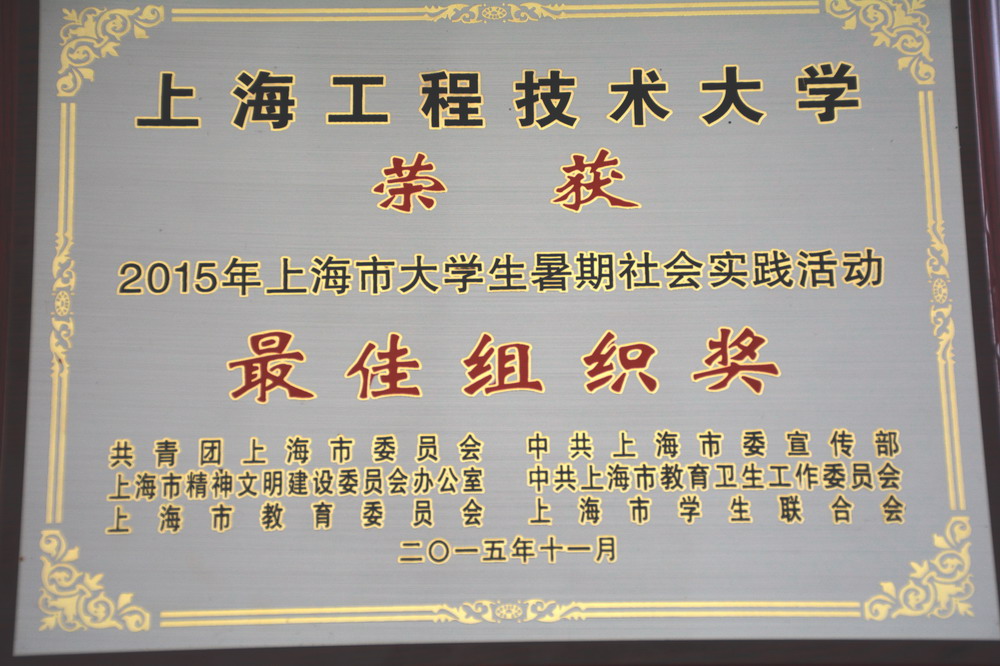 近日,由团市委主办,上海师范大学承办的“2015年上海市大学生暑期社会实践成果展示会”在上海师范大学召开。大会表彰了今年暑期社会实践中工作突出的单位、项目与个人,我校获上海市大学生暑期社会实践最佳组织奖荣誉,此外,还获得市最佳项目奖1项,市优秀项目奖8个项,“知行杯”社会实践大赛一等奖1项,优胜奖1项,市暑期社会实践优秀指导教师3名,市暑期社会实践先进个人4名。