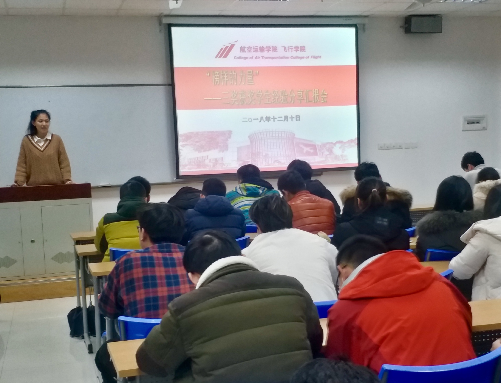 12月10日晚,由校学生资助中心主办,航空运输学院、飞行学院承办的主题为“榜样的力量”——“三奖”获奖学生学习经验分享汇报会于航飞楼6213举行。汇报会邀请到航空运输学院/飞行学院优秀学生代表,飞行技术专业“国家奖学金”获得者李国栋同学、航空器械维修专业“上海市奖学金”获得者郑双佳同学以及飞行技术专业“上海市奖学金”获得者杨骐羽同学为与会者共同分享他们的学习经验,汇报会由学生事务辅导员王诗晴老师主持。航空运输学院/飞行学院与各兄弟学院学生代表共计70余名同学参加聆听了汇报会。