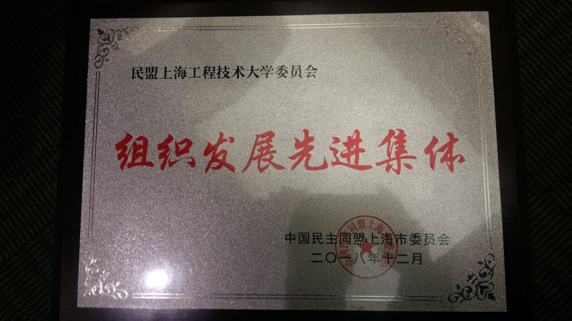 会上,盟市委表彰了2016—2018年度先进集体、先进个人,民盟上海工程技术大学委员会获得了组织发展先进集体称号, 朱翔和黄新祥两位盟员获得了2018年度中国民主同盟上海市委员会组织工作先进个人荣誉。