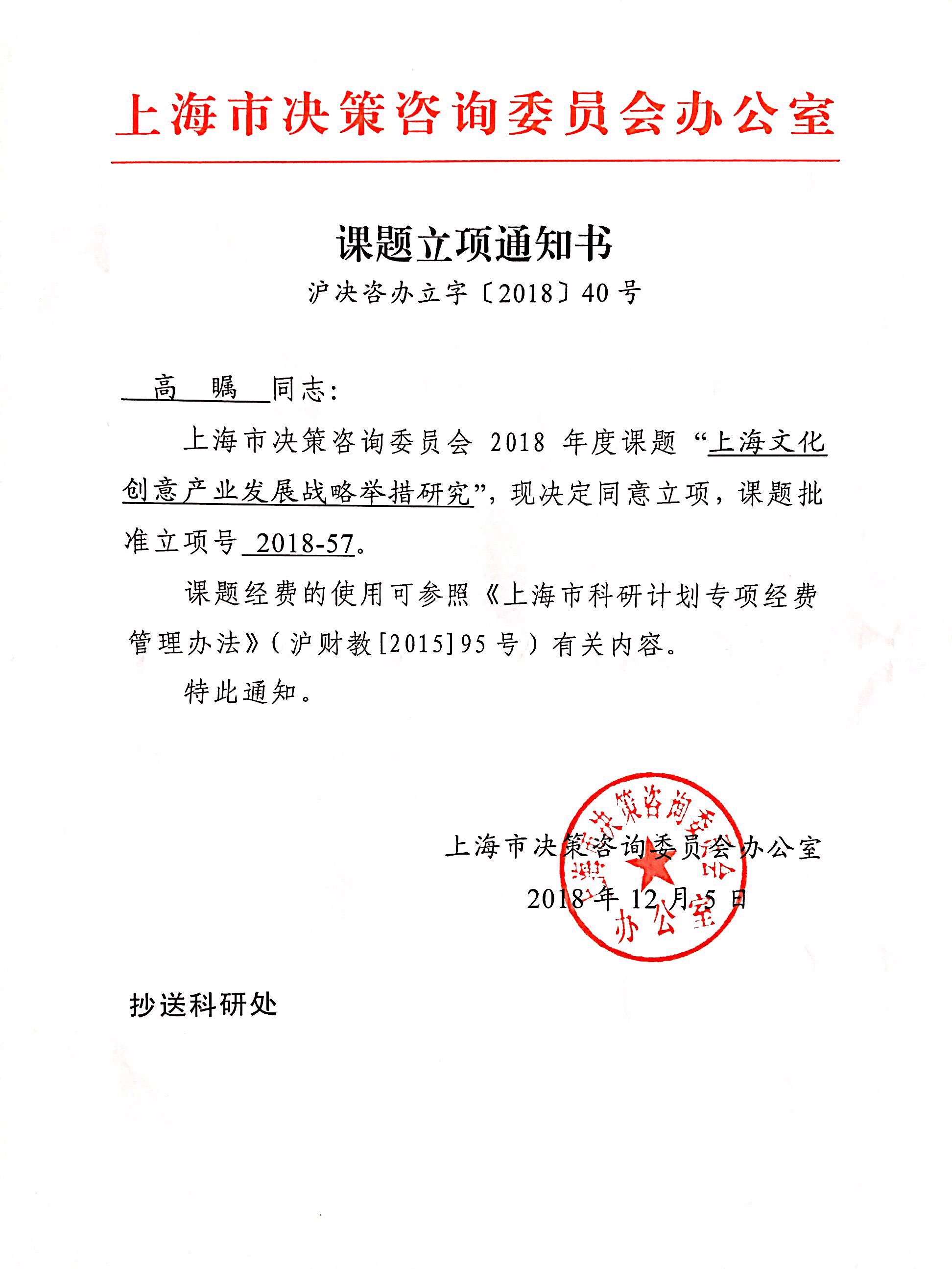 艺术设计学院高瞩教授团队获批上海市决策咨询项目近日,艺术设计学院高瞩教授团队的《上海文化创意产业发展战略举措研究》课题,获批上海市决策咨询项目(项目编号:2018-57),项目团队将与上海市人民政府研究室联合,针对《关于加快本市文化创意产业创新发展的若干意见》(简称:上海文创50条)的实施情况进行评估,并提出修订意见。