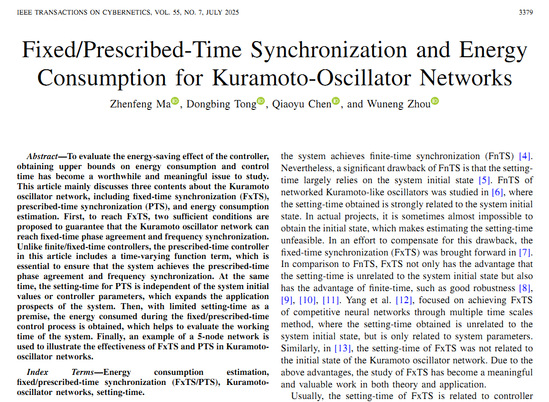 近期,电子电气工程学院童东兵教授指导硕士研究生马振峰在期刊《IEEE Transactions on Cybernetics》上,发表了题为“Fixed/prescribed-time synchronization and energy consumption for Kuramoto-oscillator networks”的最新研究成果。该期刊是美国电气与电子工程师学会会刊,系国际自动化与控制系统领域中科院SCI一区顶级期刊,2025年影响因子为10.5。