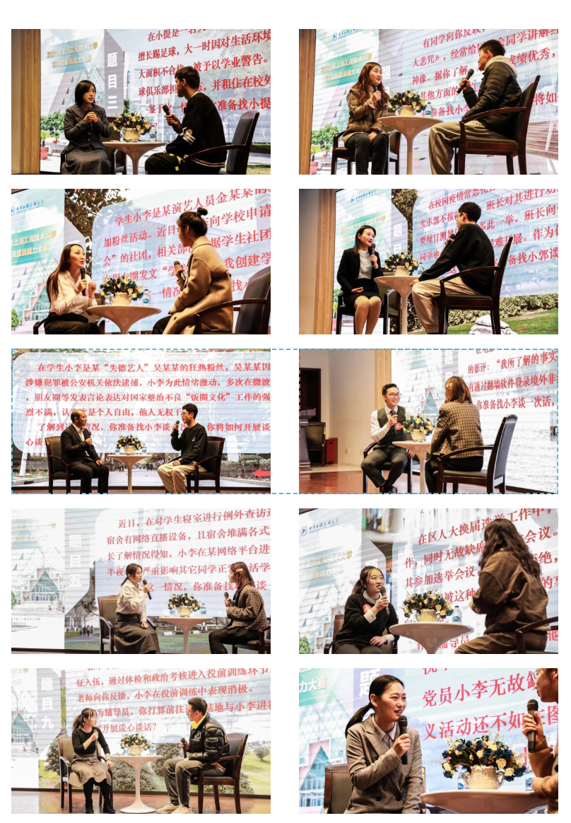 经过前期的初赛和复赛,共有10位选手进入决赛环节。决赛主要包括谈心谈话和理论宣讲两个环节。谈心谈话通过模拟谈心谈话室与提问学生开展谈心谈话,考察辅导员对学生特征、学生成长成才规律的了解把握程度,对学生的教育引导能力、解决理论困惑和实际问题的能力等,并对与学生谈心谈话过程中的解题思路、共情策略、效果反应做总结分析,接受评委的提问。现场辅导员老师们丰富的知识储备、过硬的个人素质和精彩的表现赢得了现场观众的阵阵掌声。