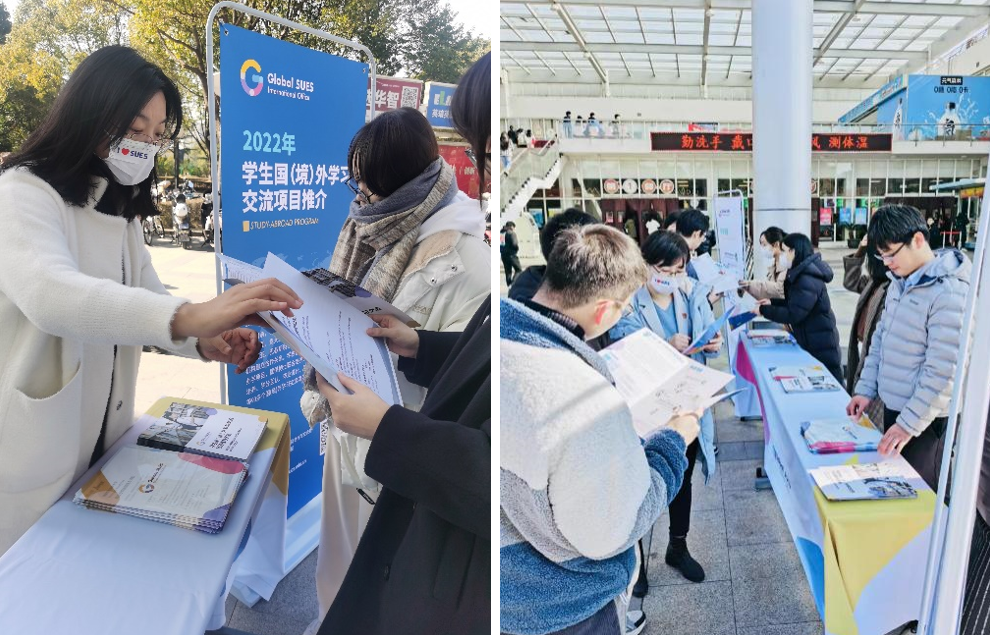 12月13日、14日中午,机关党委国交处党支部在第一食堂、第二食堂门口举行了2022年学生国(境)外学习交流项目推介活动。活动介绍了近年来我校学生国(境)外学习交流项目概况,发布了学生国(境)外学习交流项目共计94项,宣传了学校2022年各类线上、线下国(境)外学习交流项目申请流程、时间安排及资助政策等。