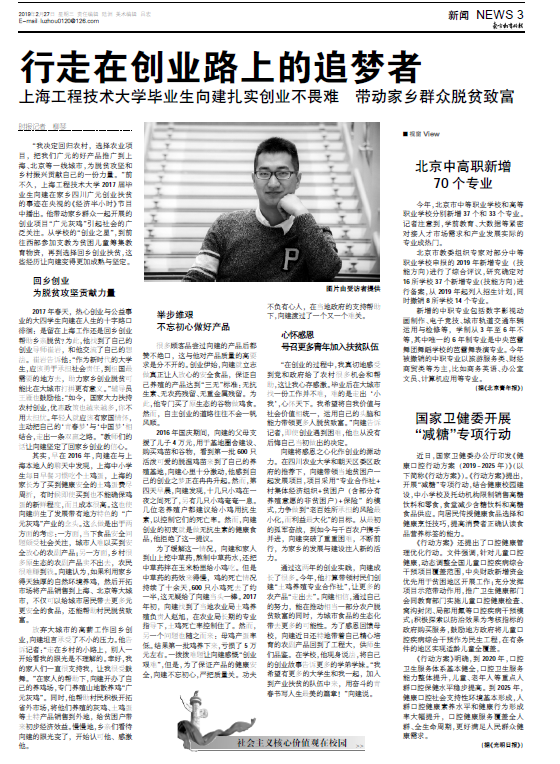 “我决定回归农村,选择农业项目,把我们广元的好产品推广到上海、北京等一线城市,为脱贫攻坚和乡村振兴贡献自己的一份力量。”前不久,上海工程技术大学2017届毕业生向建在家乡四川广元创业扶贫的事迹在央视的《经济半小时》节目中播出。他带动家乡群众一起开展的创业项目“广元灰鸡”引起社会的广泛关注。从学校的“创业之星”,到前往西部参加支教为贫困儿童筹集教育物资,再到选择回乡创业扶贫,这些经历让向建变得更加成熟与坚定。