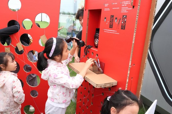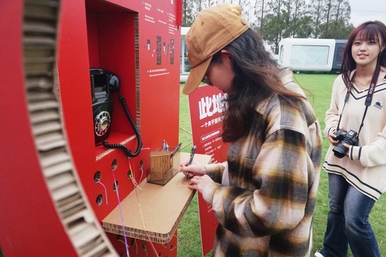 11月10日,艺术设计学院罗婧予与刘剑伟老师带领学生团队走进天马村,开展以“连接”为主题的教学实践活动。师生运用环保瓦楞纸搭建了一座红色电话亭,创作出参与式艺术装置《此地往彼地》。作品营造了一个开放而温暖的互动场域,引导参与者在“此地”与“彼地”之间展开情感与记忆的对话。