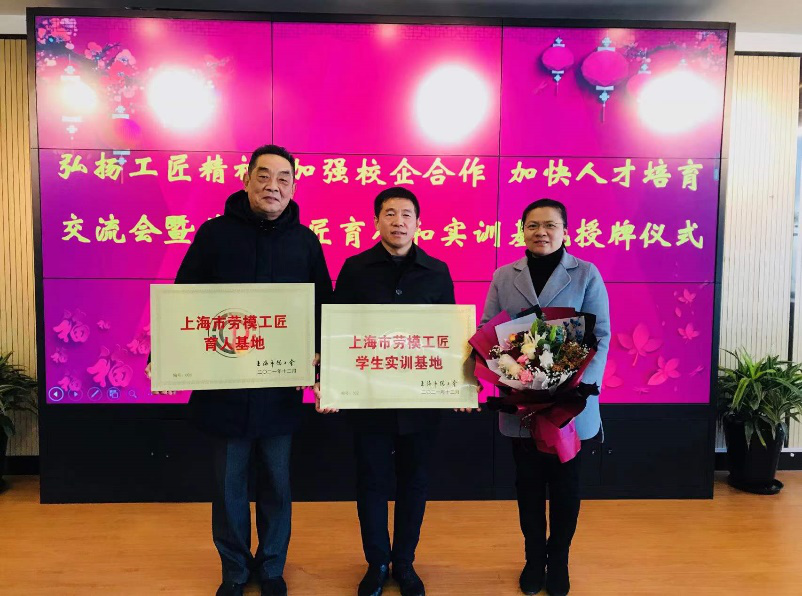 会上,上海市高级技工学校在上海市总工会主办的百名劳模工匠服务千家企业和校园活动中被授予“上海市劳模工匠育人基地”,李云先副书记代表学院校和工会接受铜牌,并与结对劳模众宏(上海)自动化股份有限公司技术总监于相武亲切交谈,合影留念。