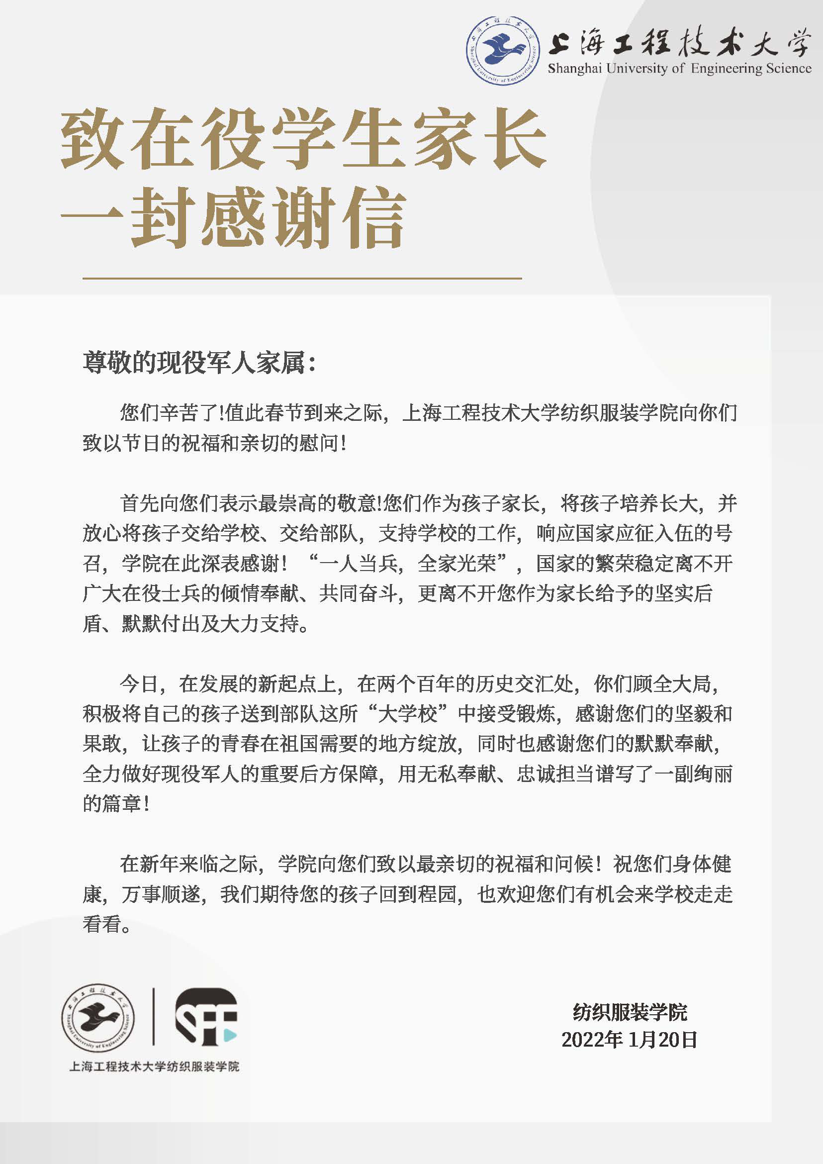 2022年春节即将来临之际,为增强现役军人家庭的荣誉感,积极营造拥军优属的浓厚氛围,纺织服装学院通过线上邮寄的方式,先后对江启源等5名学院服役学生家属进行了慰问,表达了学院的关怀和问候。学院向家长了解了学生目前在部队的服役情况,并对家属的生活情况表示了关心。