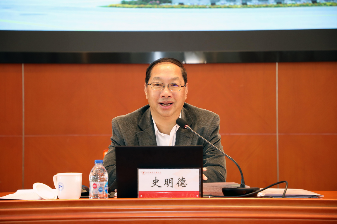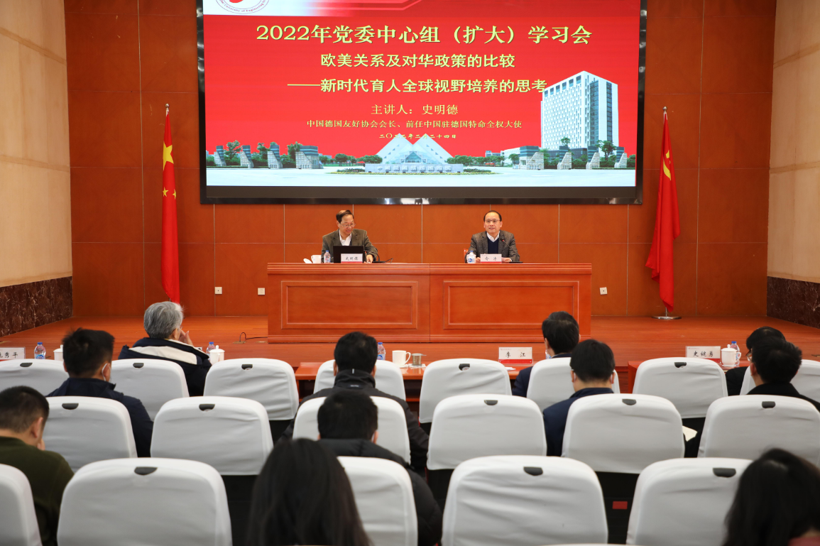 2月24日下午,学校党委理论学习中心组在行政楼B301会议室召开党委理论学习中心组(扩大)学习会,特邀中国德国友好协会会长,前驻德国、奥地利大使史明德作《美欧关系变化及其对华政策比较——新时代育人全球视野培养的思考》辅导报告,校党委中心组成员、中层干部、辅导员参会,会议由校党委副书记、校长俞涛主持。