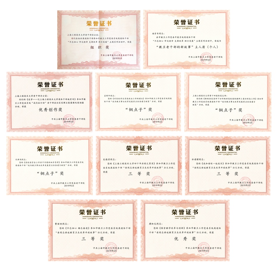 近日,市教卫工作党委在2019年老干部工作会议上表彰了2018年市教卫工作党委系统离退休干部“不忘初心、牢记使命、支持改革、助力发展”主题系列活动的获奖单位、团体和个人,我校老同志在此次活动中收获了丰硕的成果,共获得优秀组织奖1项,各类单项奖9项。党委副书记、副校长朱晓青与离退休党工委、老干部办公室的部门负责人参加会议。