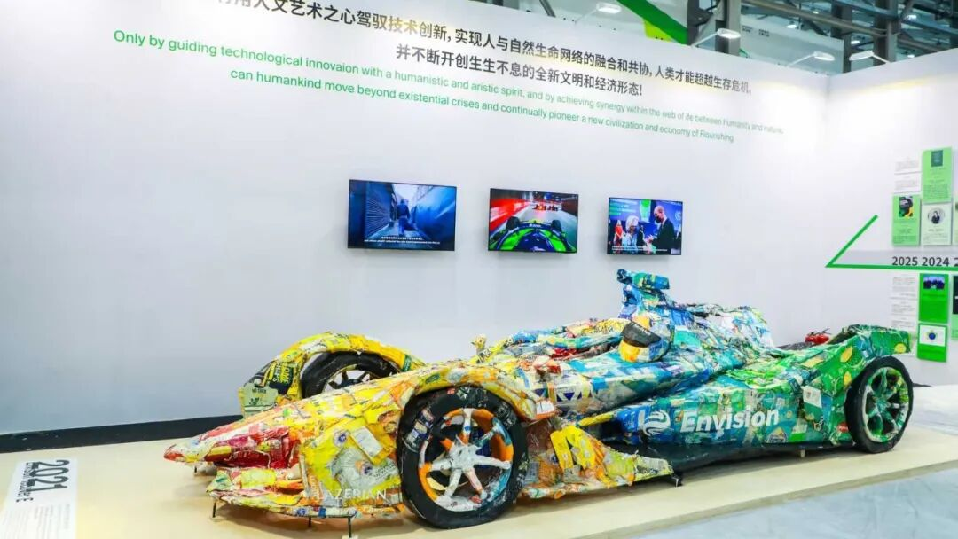 在展陈中,这些抽象理念被转化为可以直接感知的体验。观众脚下那条由回收运动鞋颗粒铺成的跑道,是娄永琪十多年前“可持续校园”设计理念的实践,以最直观的方式提醒人们:环保并非遥远口号,可以从一双旧鞋、一段路面这样的日常选择中实践,让日常物品进入循环体系。同时,入口处那辆由大量废弃塑料拼装而成的艺术装置车,也将“速度”“冠军”“废弃物”之间的张力直观地呈现出来。