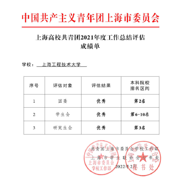 近日,团市委学校部、市学联秘书处下发《上海高校共青团2021年度工作总结评估成绩单》,我校团委、校学生会、研究生会,在全市共青团总结评估中均获评“优秀”等次,其中校团委获全市评估第2名、校研究生会获全市评估第3名。