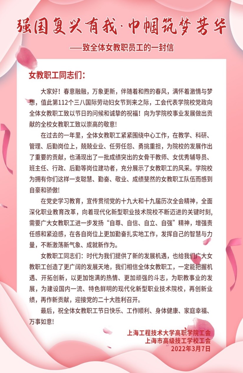 工会代表学院校党政致全体女教职工一封信。信中向全体女教职工致以节日的问候和诚挚的祝福!感谢全体女教职工在过去的一年里,紧紧围绕中心工作,在教学、科研、管理、后勤岗位上,兢兢业业、任劳任怨、勇挑重担,为院校的发展作出了重要的贡献。同时相信全体女教职工,一定能把握机遇、开拓创新,以更加饱满的热情、更加顽强的斗志,为职教事业的发展,为建设国内一流、特色鲜明的现代化新型职业技术院校,再创新业绩,再做新贡献,迎接党的二十大胜利召开。