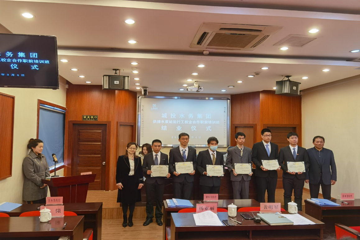 3月4日上午,高职学院与城投水务合作开办的第二批校企合作培训班迎来了结业仪式。学院党委副书记李云先、招就办主任唐丽娜应邀参加了本次结业式,学院十名2022届毕业生历经为期半个月的学习培训,全都顺利结业。