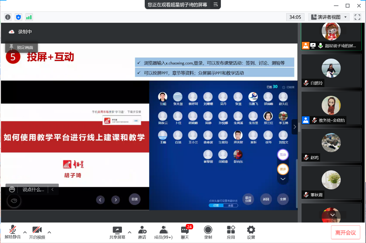 培训会上,超星集团项目经理胡老师介绍了如何登录超星平台激活课程、上传资料、建设课程章节,重点讲解了“在超星平台课程的班级活动中发布腾讯会议开启线上教学”这一平台新功能,帮助老师们快速掌握线上教学基础操作。在此基础上,进一步介绍了智能创建题库、录制视频以及如何利用超星平台开展课前、课中、课后的混合式教学等进阶内容。培训结合实际操作演示,以及签到、主题讨论、分组任务、腾讯会议、同步课堂等学习通中常用功能的实时互动,让老师们对相关操作步骤和流程有了清晰直观的认识和体验。互动答疑环节,胡老师对老师们在使用超星平台过程中遇到的相关技术问题进行逐一解答。