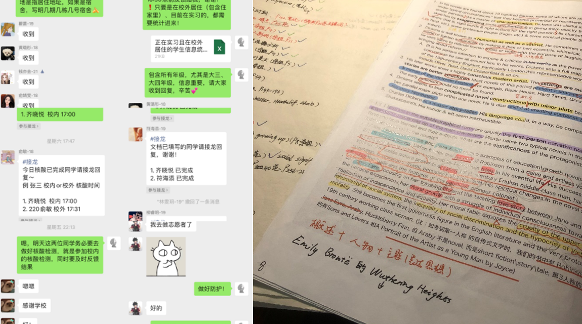 外国语学院学生自发组织了线上互助组,相互提醒,相互帮助,一起进行核酸检测,目前学院所有在校师生已100%完成三轮核酸检测。同学们通过互助组分享学习笔记,交流学习心得,学习上海市和学校的疫情防控政策与措施,共同坚持健康生活习惯,保持积极乐观情绪,认真开展网课学习,做到胸有大志、心有大我、肩有大任、行有大德。