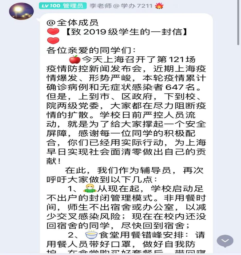 为了强化思想引领,引导学生充分认识到当前疫情形势的严峻性和复杂性,营造一个同心战疫、共克时艰的良好校园氛围,学院辅导员们立刻行动起来召开“云间”班会。杨建豪老师面向所带班级召开以“爱国于心,荣校于情”的线上主题班会。为学生分析上海当下疫情形势,明确了封闭管理阶段,足不出户、线上教学、错峰用餐、杜绝快递和外卖等工作要求,鼓励学生们在大是大非面前,要做万众一心、齐心抗疫道路上积极的践行者和实践者,将爱国情、强国志、报国行融入到共同抗击疫情的“战斗”中,书写大学生不平凡的爱国热情!