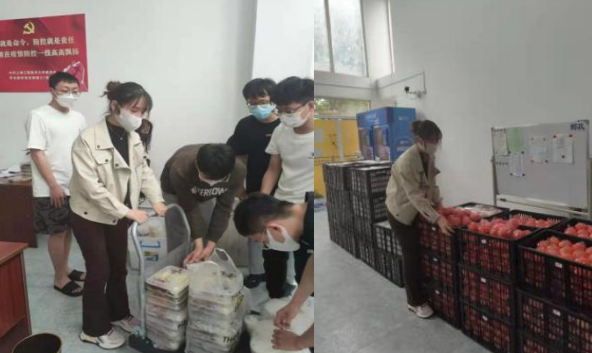 中共上海工程技术大学委员会学生临时党支部第21党小组在六期帮忙派发校友会捐赠的一百箱苹果和橙子。