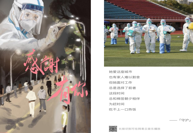 在这场校园疫情防控战中,材料学子们纷纷以“艺”抗疫,充分发挥艺术才能,用自己原创的艺术作品致敬身边的志愿者和大白。2020本科生张建飞的书法作品《同心抗疫》,充满力量,鼓舞人心;电子封装技术专业本科生莫若诗的手绘作品《点亮·感恩有你》,用以致敬守护温暖和希望的大白,还有本研志愿者学生们共同拍摄制作的防疫宣传视频《最美逆行者》,都让人瞬间泪目;2021级本科生张俊彪、宋桂霞与学院沪语社团倾情打造的原创RAP《守“沪”》,用音乐与歌声治愈心灵的EMO,迅速在朋友圈中刷屏……同学们坚信,没有一个冬天不可逾越,没有一个春天不会来临,只要我们勠力同心,就一定能战胜疫情,共迎花开!