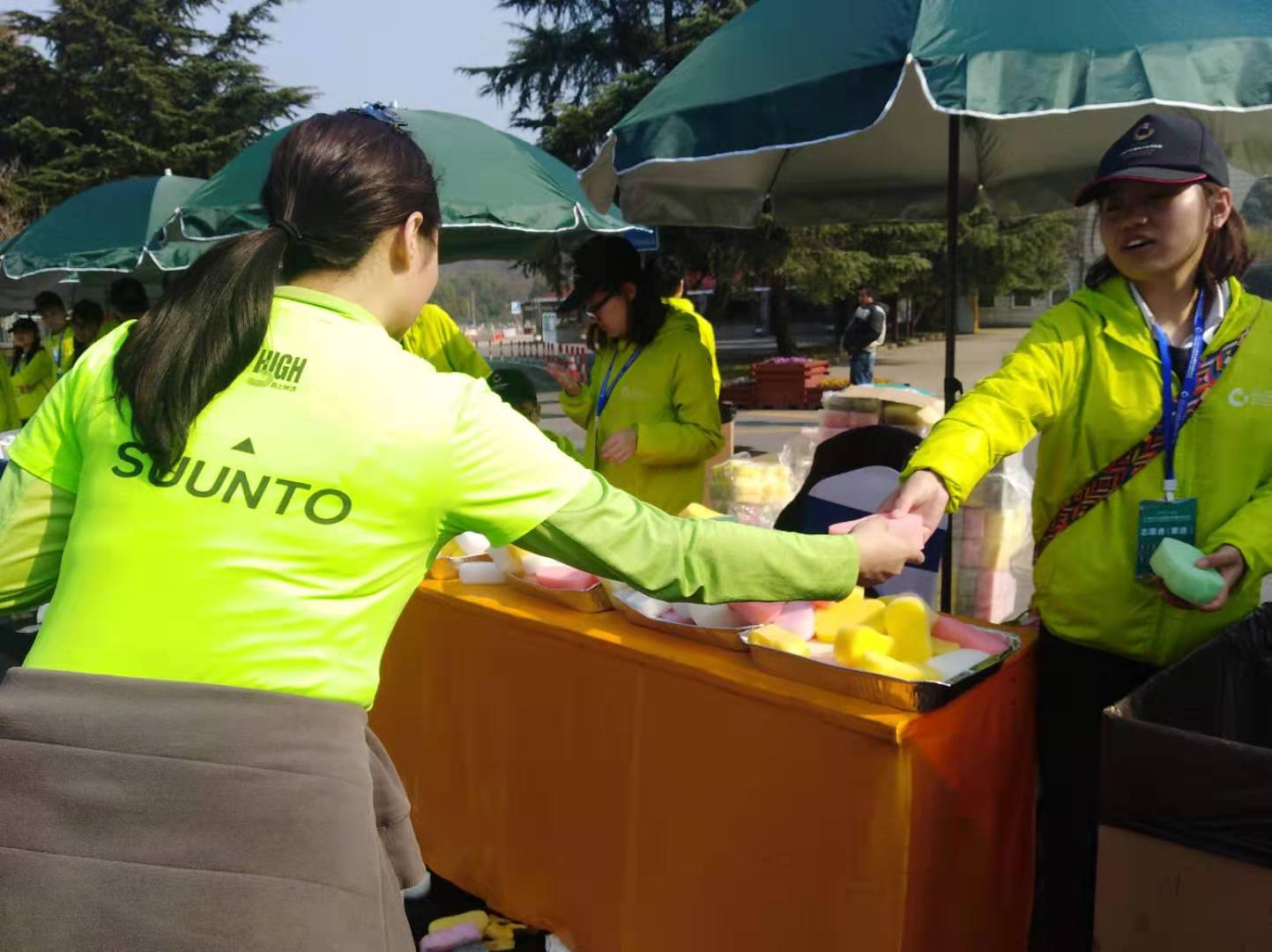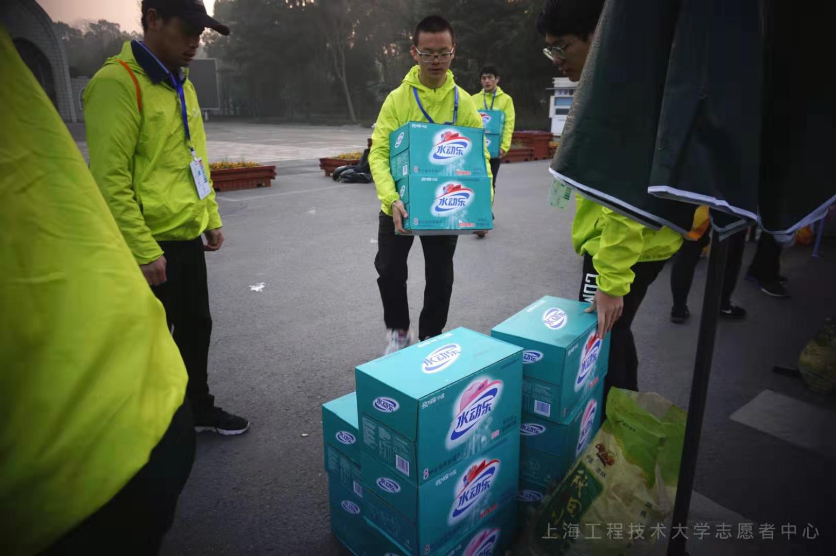 此次赛事我校志愿者承担了比赛5公里和7.5公里选手补给区的服务工作,负责为志愿者分配发放水果、运动饮料、吸汗海绵等补给用品,并为需要帮助的选手提供帮助。为确保做好保障工作,凌晨5点,学校全体志愿者便已出发前往工作地点,忙碌而有序的做好赛前准备工作:放置桌椅、搬运饮用水和饮料、洗水果、拆卸包装、浸湿海绵等。早晨的低温丝毫不能降低志愿者们的热情,早起的困倦也在准备工作中一扫而空。