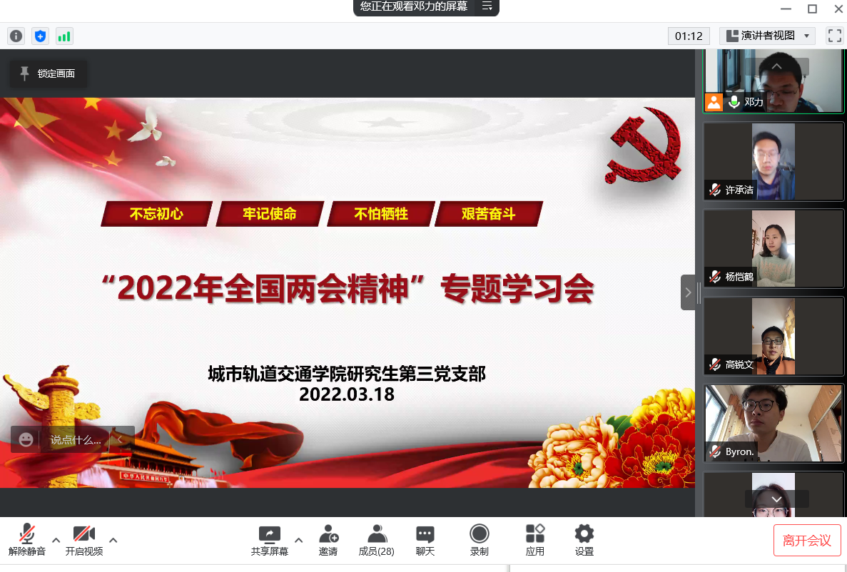 为深入学习贯彻习近平总书记重要讲话精神和全国两会精神,3月18日,城市轨道交通学院党委召开线上中心组学习会,学院党委中心组成员出席会议。会议由学院党委书记万慧琳主持。