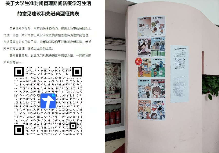 艺术设计学院副书记刘江与党办副主任王成涛积极行动联系组内辅导员与党小组组长,召开线上会议,解读政策要求,分布下发详细任务,线上线下联动。赶制原创手绘防疫海报在楼宇内进行张贴宣传。并制作调研问卷,辅导员与党小组组长积极发挥党员模范作用,一同入户宣讲,在收集学生诉求,解答防疫困扰的同时,做到防疫宣传无死角,共同筑起防疫坚强堡垒。