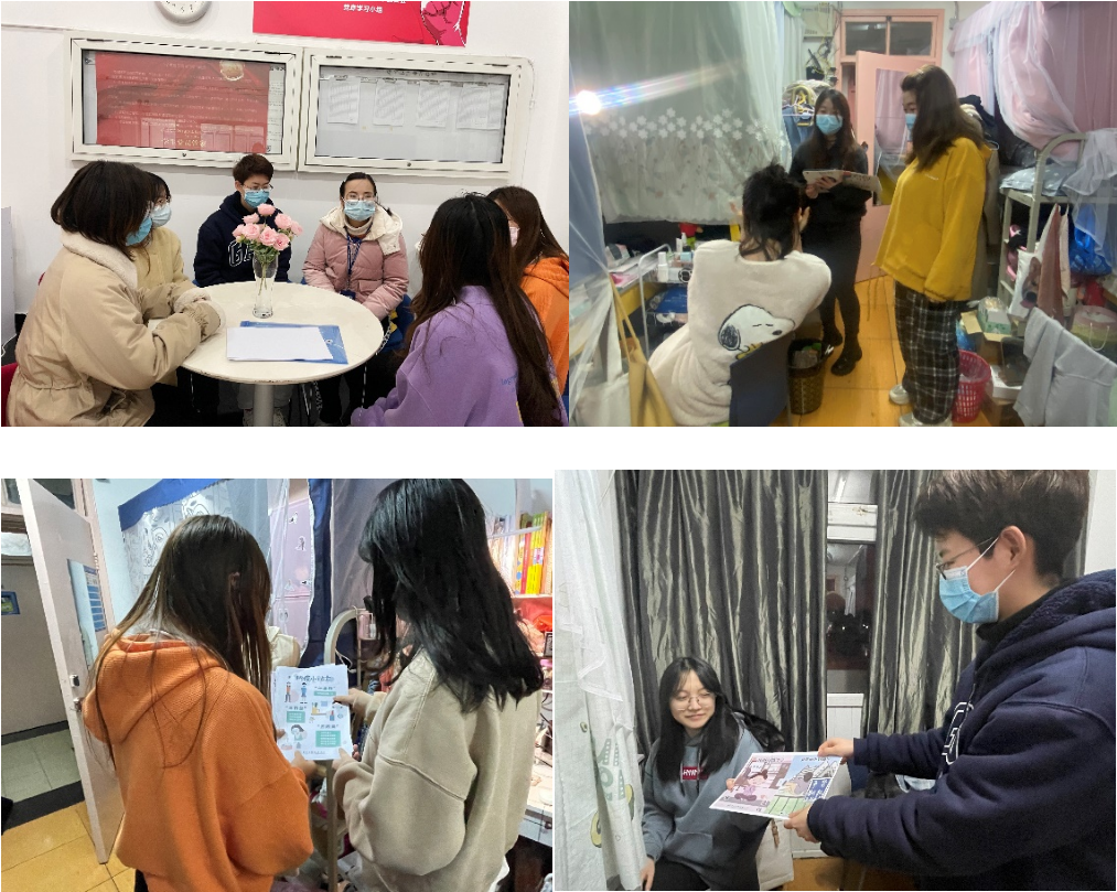 辅导员通过与楼长、党小组交流,详细了解学生的日常作息和上网课情况,倾听学生们对校园生活的感受,高效落实疫情防控的各项举措,及时掌握所有在校生的身心健康状况及思想动态,全力守护学生安全、维护校园稳定。并通过楼宇党小组分发宣传物料,及时和学生分享有关疫情的新闻、科普等,引导他们正确面对疫情,科学防护,不恐慌、不信谣、不传谣。