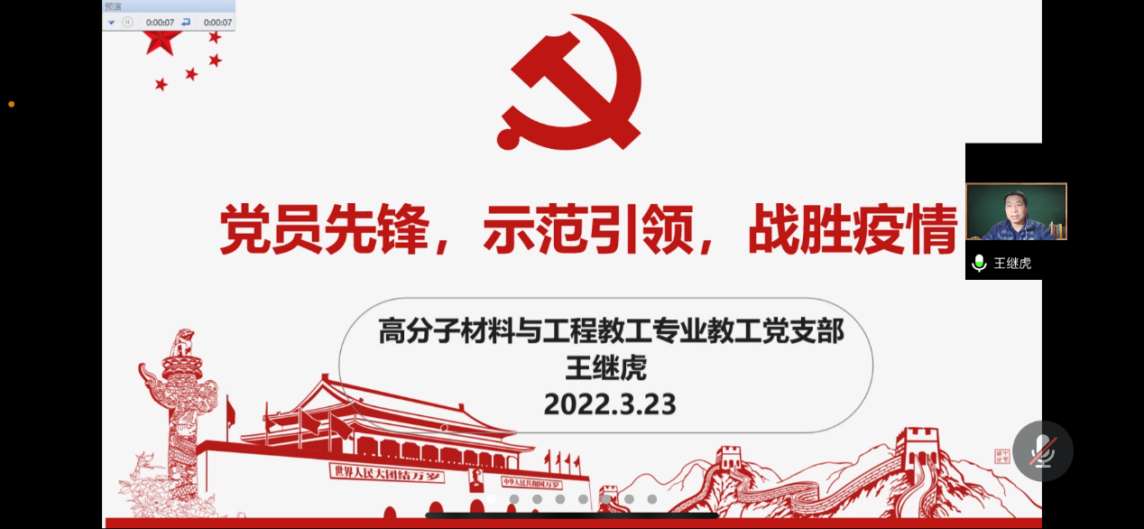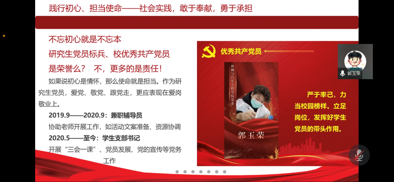 王继虎老师做了题为《党员先锋 示范引领战胜疫情》的交流发言,王老师分享了其参与抗击疫情的志愿服务经历并寄语所有学员要不断加强自身学习、提高思想政治觉悟,发挥党员先锋模范作用。郭玉荣同学分享了自己担任临时党支部小组长的心得并从学习、科研竞赛、社会实践多个方面分享了自己如何践行初心、担当使命,希望各位学员能够立足当下,发挥好“程园”精神,不松劲、不停步、再出发!