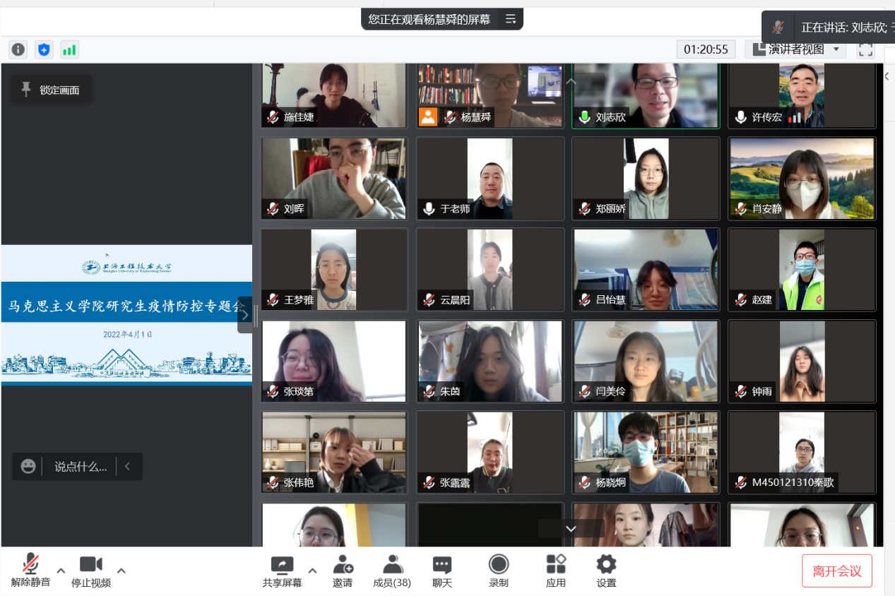 为深入学习李强书记在全市领导干部大会上的重要讲话精神,落实学校疫情防控工作部署要求。4月1日上午,马克思主义学院召开研究生疫情防控专题会,马克思主义学院党总支书记许传宏、院长刘志欣、副院长于凯、辅导员杨慧舜以及全体研究生出席会议。会议以线上方式召开,由马克思主义学院院长刘志欣主持。