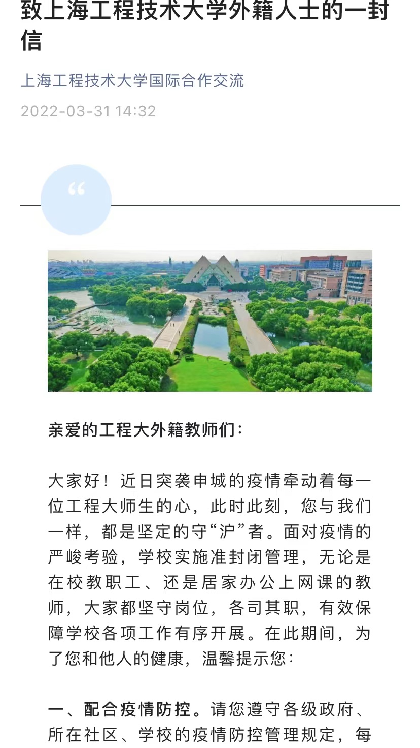 防疫不停歇,工作不间断。国际合作与交流处以三型机关建设为指导,坚持“岗位建功,服务师生”理念,发出《致上海工程技术大学外籍人士的一封信》,号召全体外籍教师配合疫情防控、关注权威信息和加强自我防护。同时,关注中外合作办学进程和国际合作与交流的核心工作,关心关爱海外交流学习的学生和在校留学生,积极助力学校的疫情防控工作。
