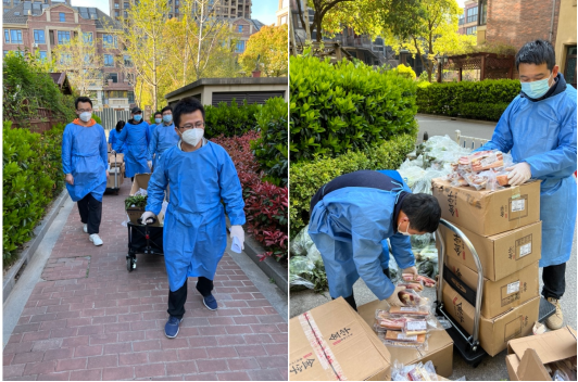 沈骏同志担任嘉定区安亭镇六泉桥居委会苏河源社区的抗疫物资输运志愿者工作,负责配送小区内62号和63号27层高层楼共108户家庭的物资分发,物资包括莴笋、西蓝花、包菜、咸肉、牛奶。物资由志愿者统一配送上门,发放过程秩序井然,有效缓解了封控期间居民蔬菜紧缺的困难。傅允准同志担任所居住区域万源城四期的志愿者工作,负责所在楼栋共32户家庭的物资和蔬菜分发。