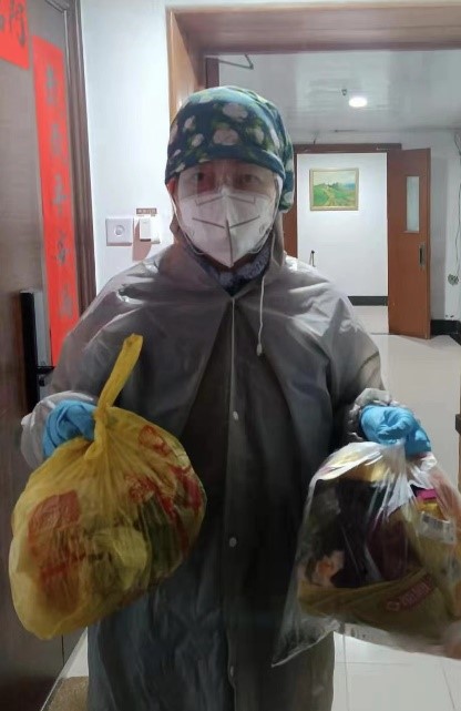 张宇清老师在校内值班后回到小区,第一时间参加小区志愿服务,因为资源紧张,张老师自备防护装备上门为邻居们处理湿垃圾。