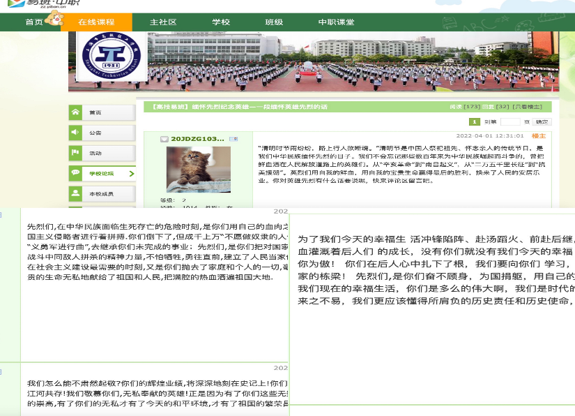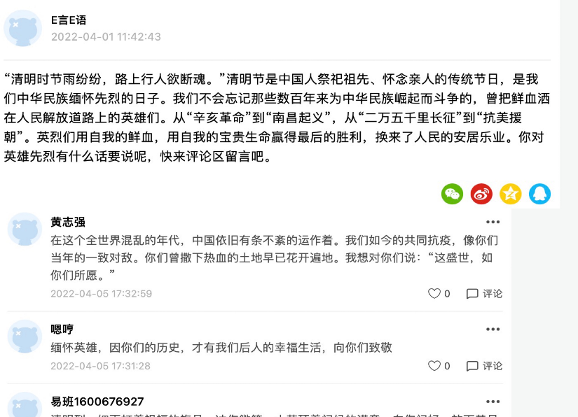 为了让学院校同学们更深刻地感受清明节传统文化的内涵,引导大家缅怀革命先烈、讴歌民族英雄,懂得感恩、乐于奉献、知书达理、珍惜美好幸福生活,“致敬英雄——一段缅怀英雄先烈的话”活动在易班网上开展。各班同学纷纷写下自己的感想,重温伟大的中国共产党走过的辉煌历程,表达对数百年来为中华民族崛起而斗争的,曾把鲜血洒在人民解放道路上的英雄们的崇高敬意,抒发对祖国深沉的爱。
