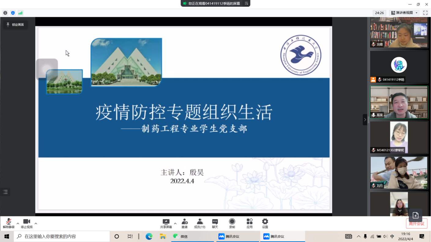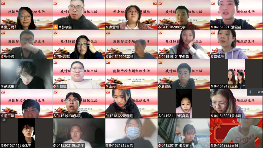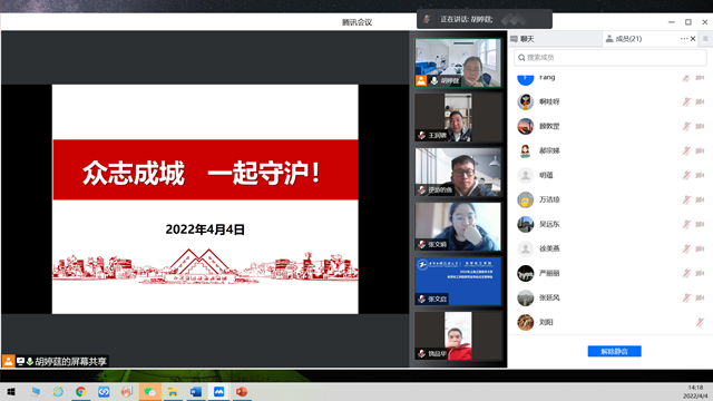 4月4日至5日,各党支部组织党员和部分群众开展了在线学习。会上,大家认真学习了孙春兰副总理对上海的疫情防控工作要求,详细讲解了学校疫情防控工作的十一项要求。会上还传达了学院疫情防控工作会议的精神,要求学院教师关注关心所指导研究生和本科生的生活学习情况和思想情绪,及时排忧解难;认真做好在线教学和学生指导工作,保质保量完成线上教学任务;鼓励大家特别是教师党员积极参加社区志愿活动,发挥党员先锋模范作用。