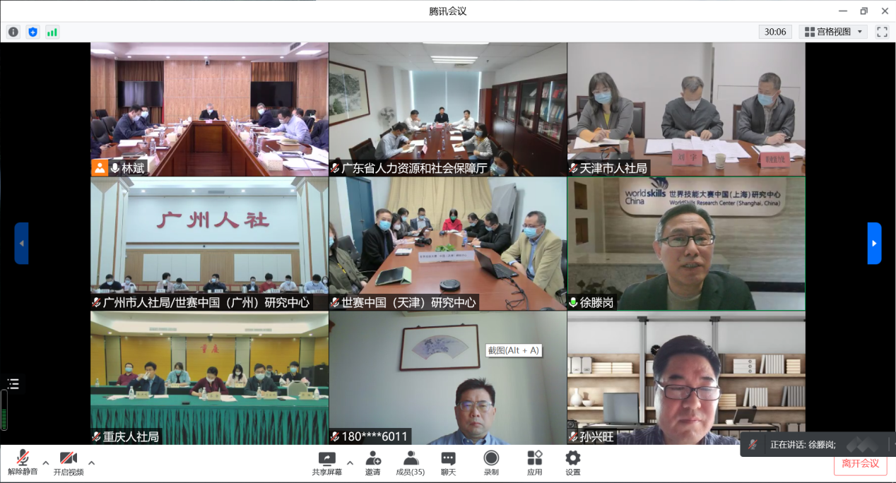 为进一步贯彻落实习近平总书记重要指示精神,努力办成一届“富有新意,影响广泛”的世界技能大赛,人社部于4月8日以视频会议形式召开世界技能大赛中国研究(研修)中心会议。人社部副部长汤涛,职建司司长刘康,国际司副司长吕玉林,以及天津市、上海市、重庆市、广东省人社厅(局)分管职业竞赛的厅(局)长、职建处处长,天津、上海、重庆、广州世赛研究(研修)中心负责人及有关人员参加会议。我校世赛中国(上海)研究中心全体成员参加了本次会议。