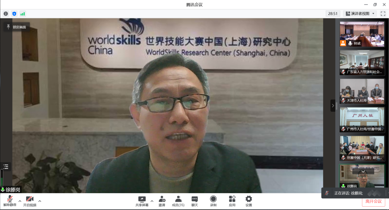 我校世赛中国(上海)研究中心徐滕岗主任汇报了中心工作情况、并对办好第46届世界技能大赛提出了相关意见建议。他在发言中首先报告了2021年至今我校世赛中国(上海)研究中心开展的理论研究以及参加人社部、第46届世界技能大赛上海执行局、世界技能组织(WSI)相关工作情况。他结合本中心的相关研究分析,对第46届世界技能大赛成功举办提出8条建议,包括世赛办赛风险评估、在国际技能论坛发出中国声音、推进世界技能运动方案等,提出“技能是人类社会生生不息的社会活动。技能培育文明,技能形塑传统。面对智能制造新时代,技能创新将憧憬天下大同”。