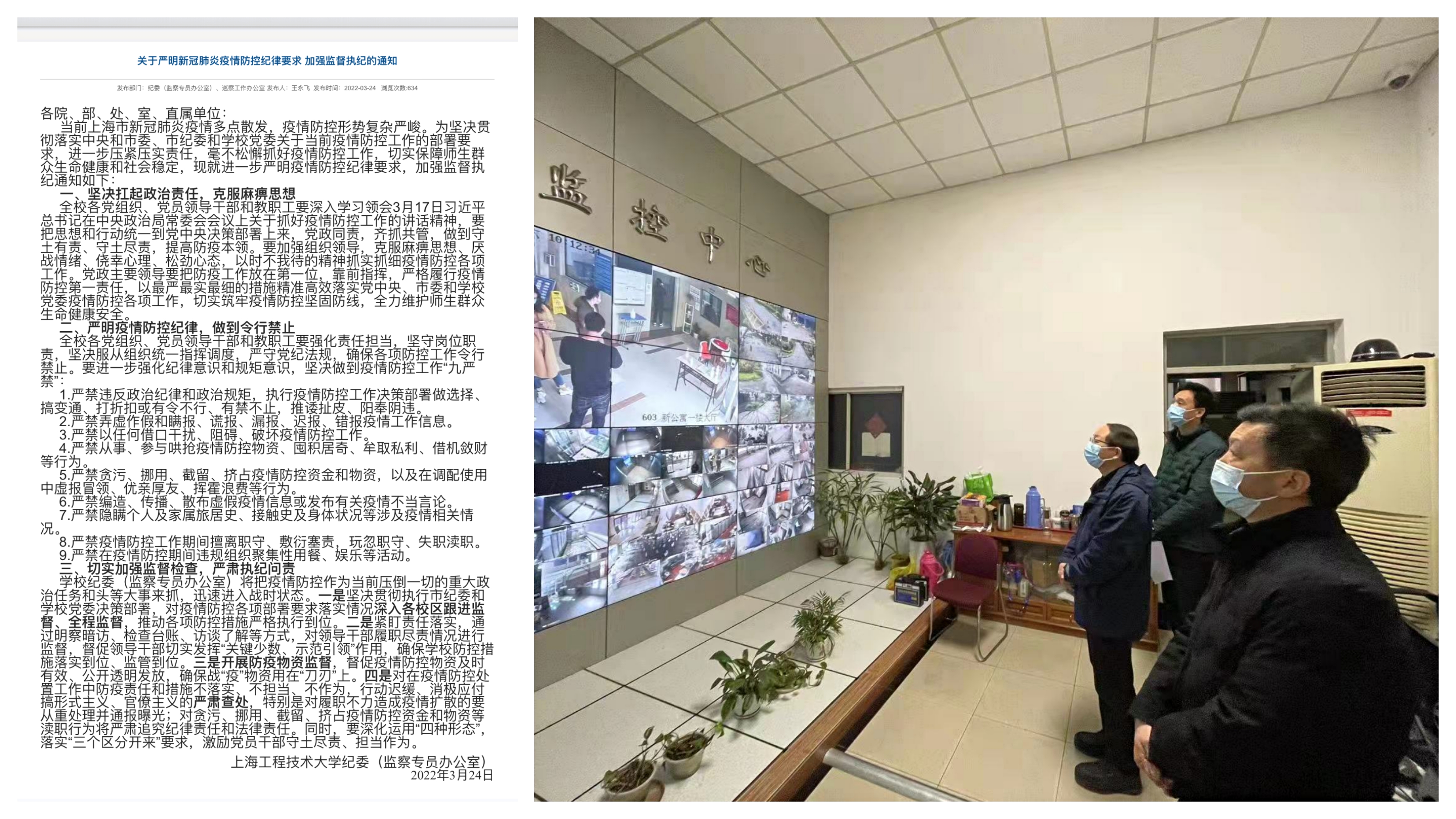 为切实做好学校疫情防控工作,确保校园安全稳定和师生身体健康,校纪委坚决扛起疫情防控监督政治责任,第一时间通过校园网和程园清风公众号刊发《关于严明新冠肺炎疫情防控纪律要求,加强监督执纪的通知》,并定期发布相关典型案例和纪法教育知识等,督促压实各级党组织疫情防控主体责任和重点部门职能监督责任,确保全校师生在思想和行动上与疫情防控各项决策部署要求同频共振、同向发力。纪委书记门妍萍同志担任虹口校区疫情防控工作专班班长,指导督导工作,细化督促完善总体方案、各专班工作方案。纪委副书记段海霞、巡察办常务副主任刘珺、审查调查室主任梅运笋先后进驻学校松江校区和虹口校区,通过列席疫情防控工作会议、明察暗访监督疫情防控政策落实情况、开展疫情防控物资采购监督检查等方式推进疫情防控政治监督具体化常态化,及时发现问题,予以提醒,确保学校疫情防控政策落实到位,取得实效。