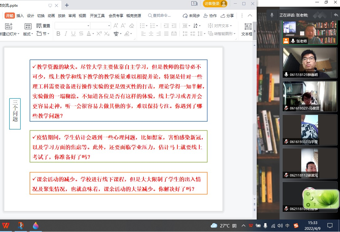 交流主要围绕线上教学是否已经适应;拟定第9周线上考试,是否准备好了;目前心态如何;与父母、室友相处要互相体谅,互相帮助,共度难关等展开。