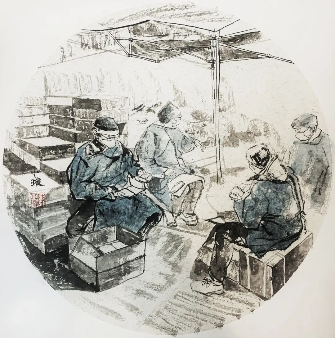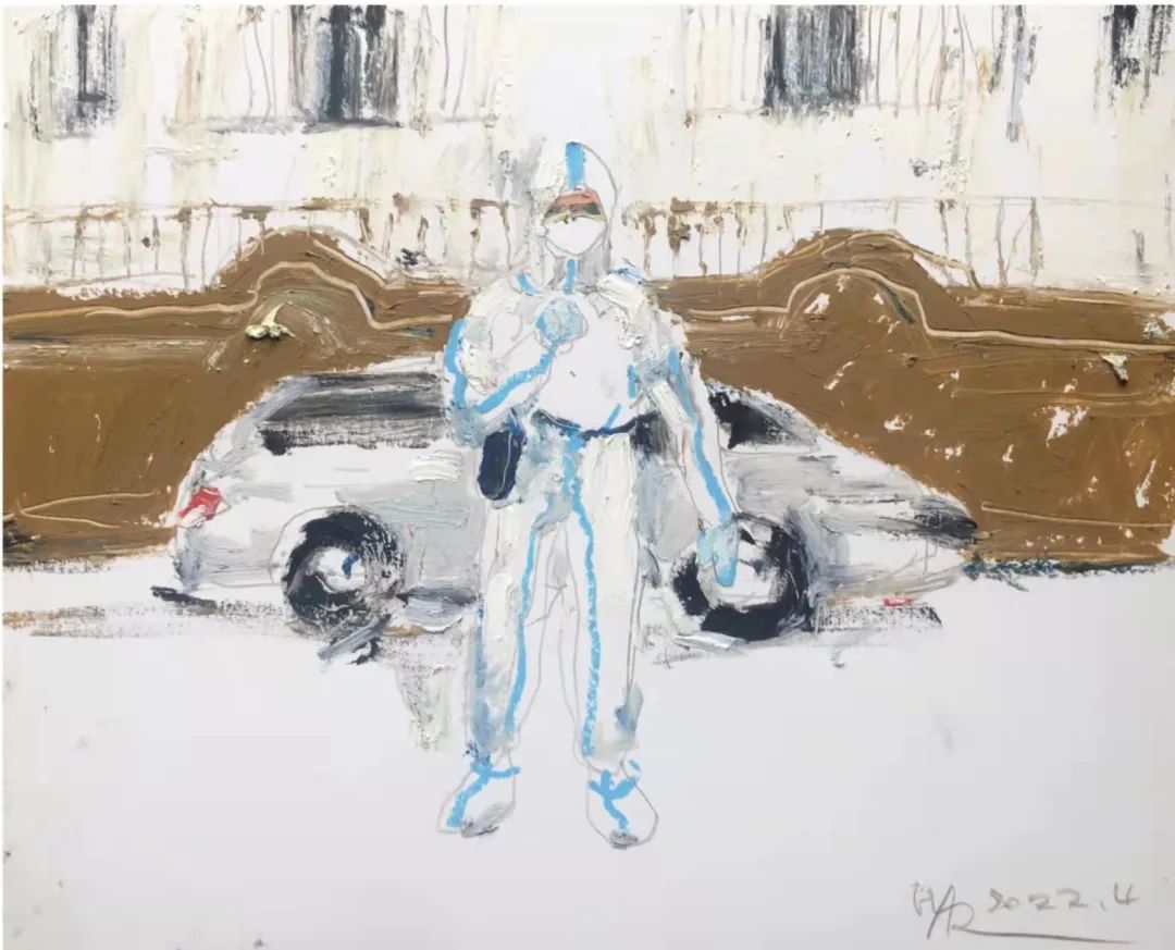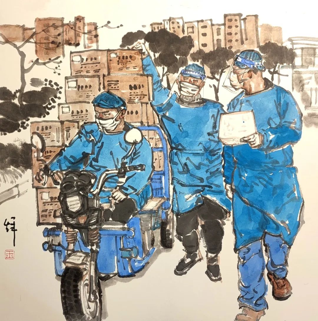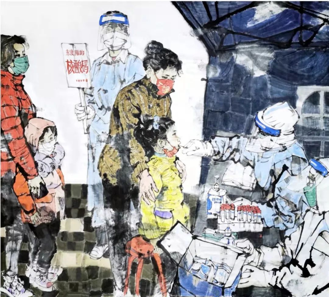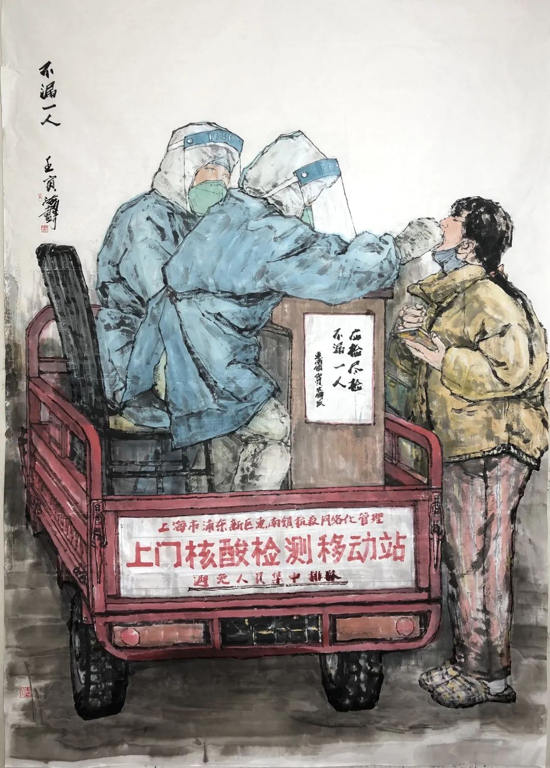 为尽快遏制疫情扩散蔓延,尽早实现社会面动态清零,根据前期核酸筛查情况,4月4日,上海市在全市范围内开展一次核酸检测。在上海市奉贤区奉浦街道,一辆经过改造的“移动核酸检测车”在社区内上路服务,为辖区内民众提供检测服务。“不漏一人”,画家瞿剑宛以彩墨写意的方式记录下了上海抗疫现场中细致工作的这个瞬间。