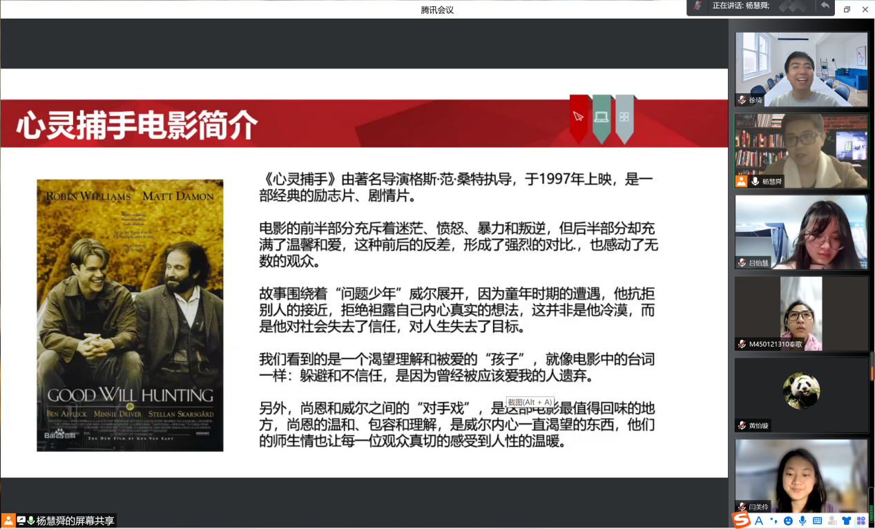 抗疫期间,为进一步丰富同学们的心理知识和课余生活,引导马院研究生更好地“接纳自己 怀抱他人”,做好疫情防控期间的心理调适。4月14日晚,马克思主义学院组织开展系列心理活动——师生共同观看《心灵捕手》电影活动。活动由心理辅导员杨慧舜老师主持,全体研究生参加了本次活动。