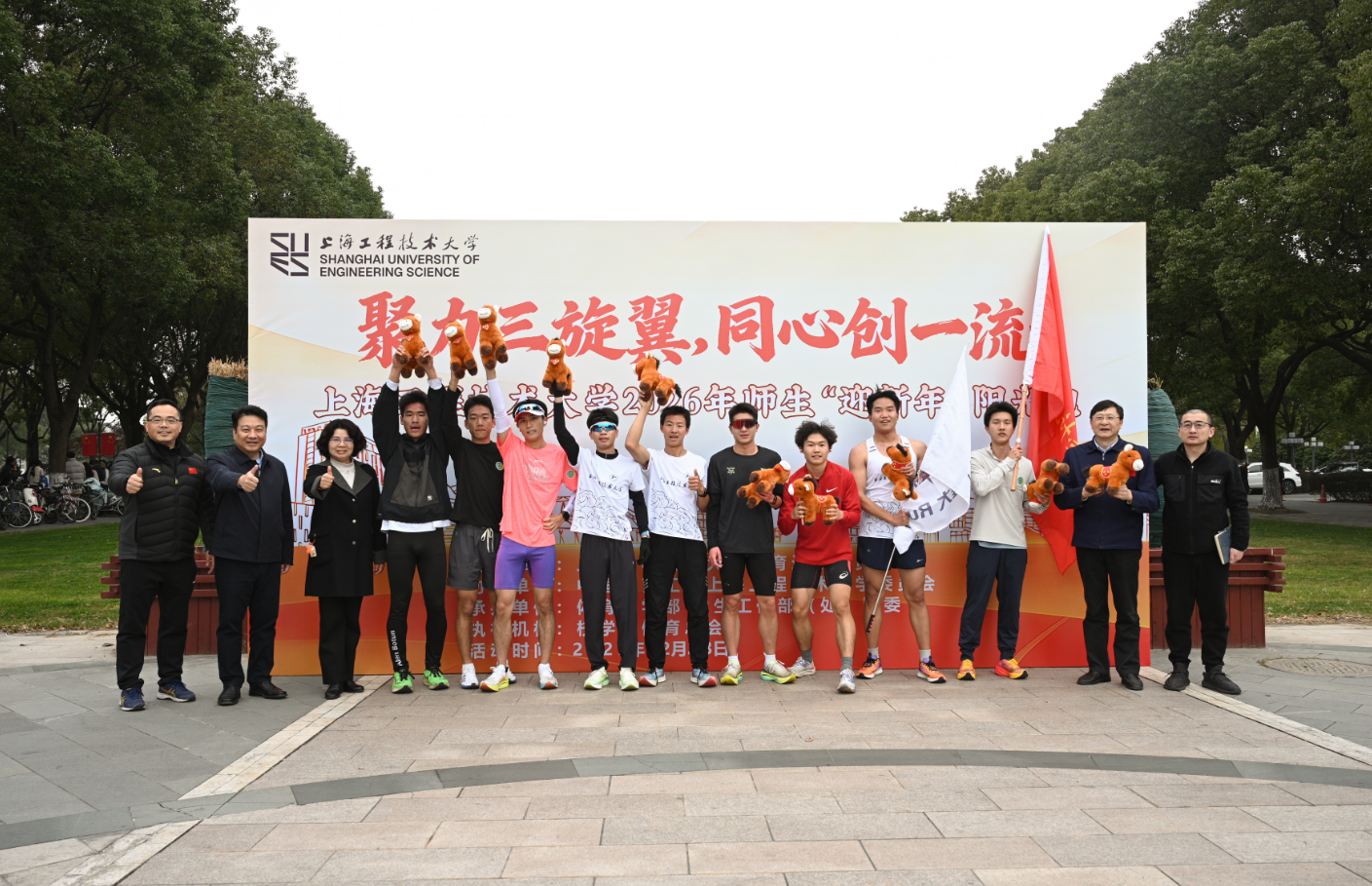 12月23日下午,上海工程技术大学2026年师生“迎新年”阳光跑在松江校区热力开跑。校党委副书记朱晓青,党委副书记、纪委书记孟星,党委副书记、副校长、校体育运动委员会主任徐阳,各机关处室、各学院600余名师生齐聚图书馆博学广场,用环“上工程”约3公里奔跑迎接新年。活动以“聚力三旋翼、同心创一流”为主题,旨在以体育精神凝聚改革动能,为“十五五”开局吹响奋进号角。