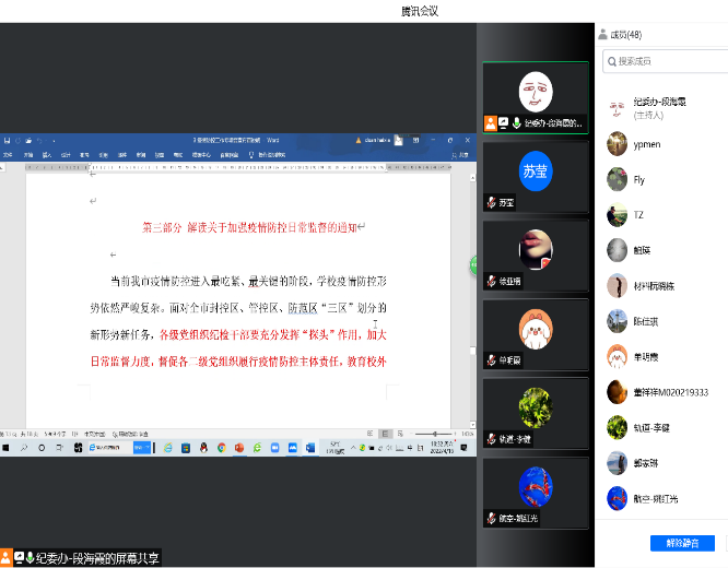 疫情期间,校纪委坚决扛起疫情防控监督政治责任,第一时间通过校园网和程园清风公众号重申纪律要求,并定期发布相关典型案例和纪法教育知识等,督促压实各级党组织疫情防控主体责任和重点部门职能监督责任。专职纪检监察干部先后进驻各校区通过列席疫情防控工作会议、明察暗访、开展疫情防控物资采购监督检查等方式督促疫情防控政策落实落细。校纪委委员、各级纪检委员立足本职岗位发挥“探头”作用,共同织密学校疫情防控网。相信通过本次会议,全体专兼职纪检监察干部、督查组成员和广大师生会进一步凝聚共识、同心守“沪”,共克时艰。