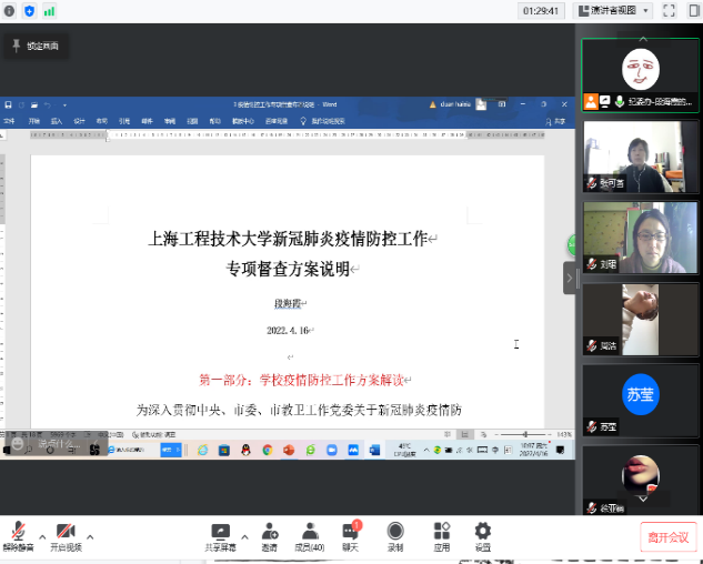 会上,校纪委副书记段海霞同志就《上海工程技术大学新冠肺炎疫情防控工作专项督查方案》和《关于加强疫情防控日常监督的通知》进行了详细解读并作了动员部署。