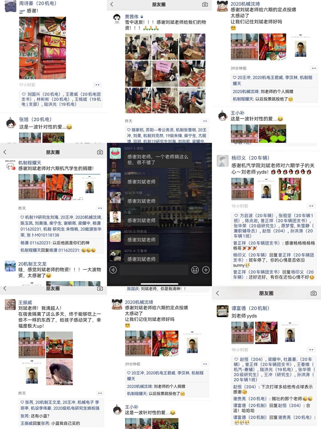 当晚,学院值班老师以及志愿者共同努力打通了“最后一公里”,为六期研究生送上了爱心物资。学生们纷纷在群里表达感谢,“感谢刘老师”“刘老师yyds”“感谢刘老师的关爱”等刷爆学生的朋友圈。同时,在机械与汽车工程学院的大家庭中,老师们也为刘老师的善举点赞,纷纷表示尽已之力,共克时艰。