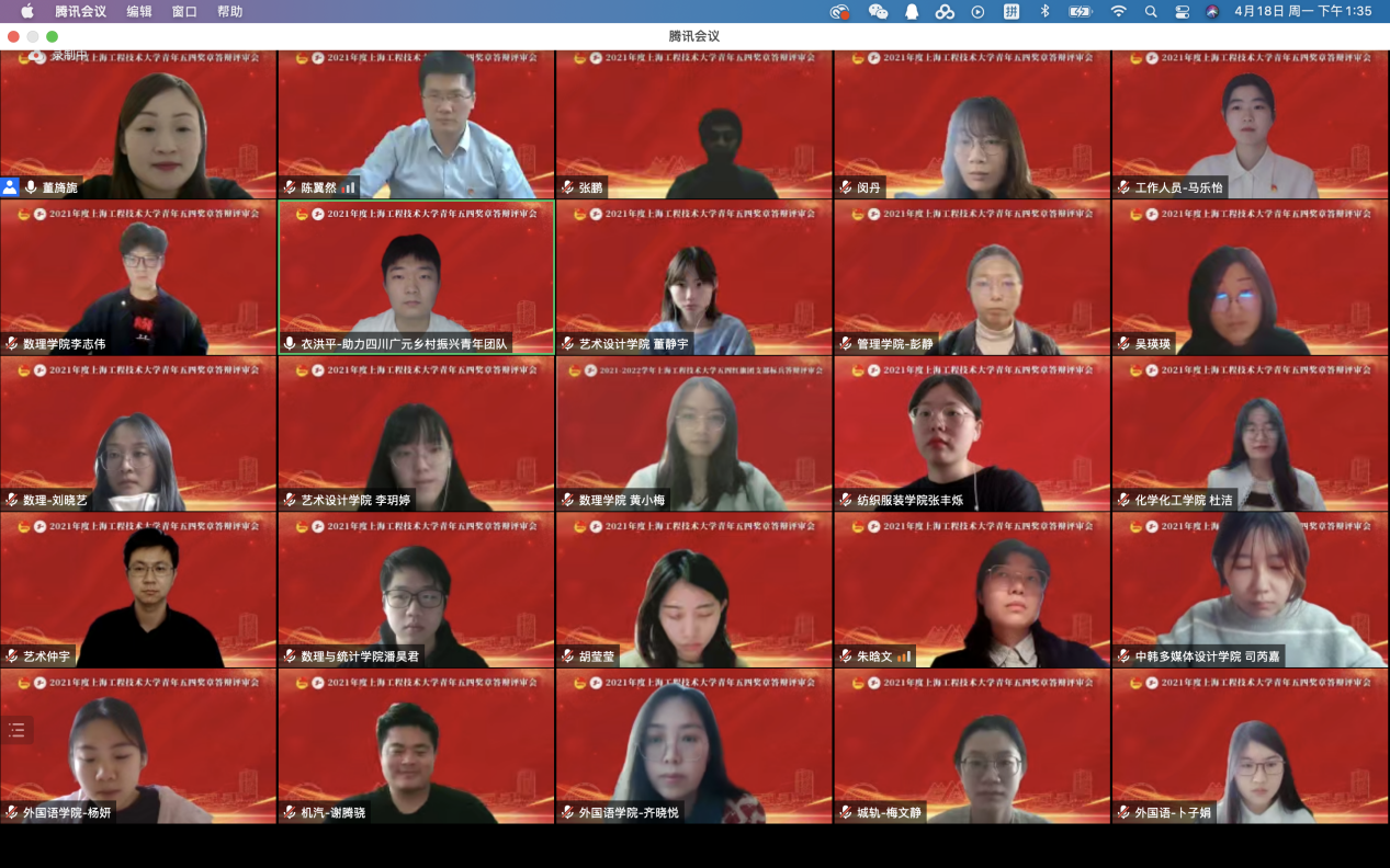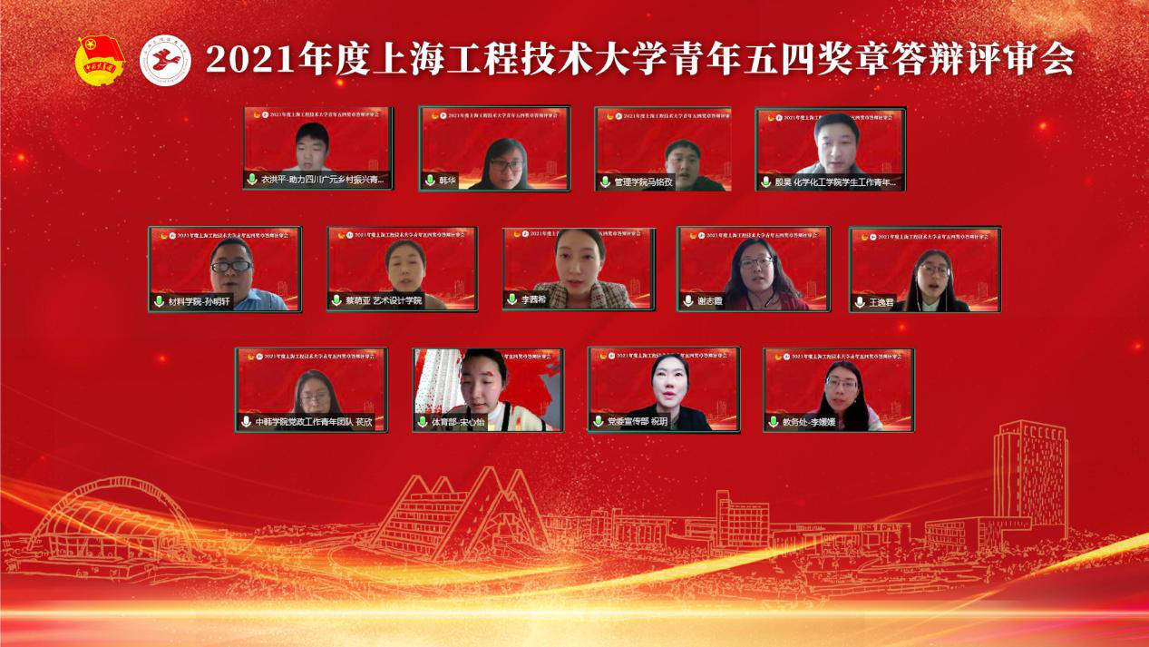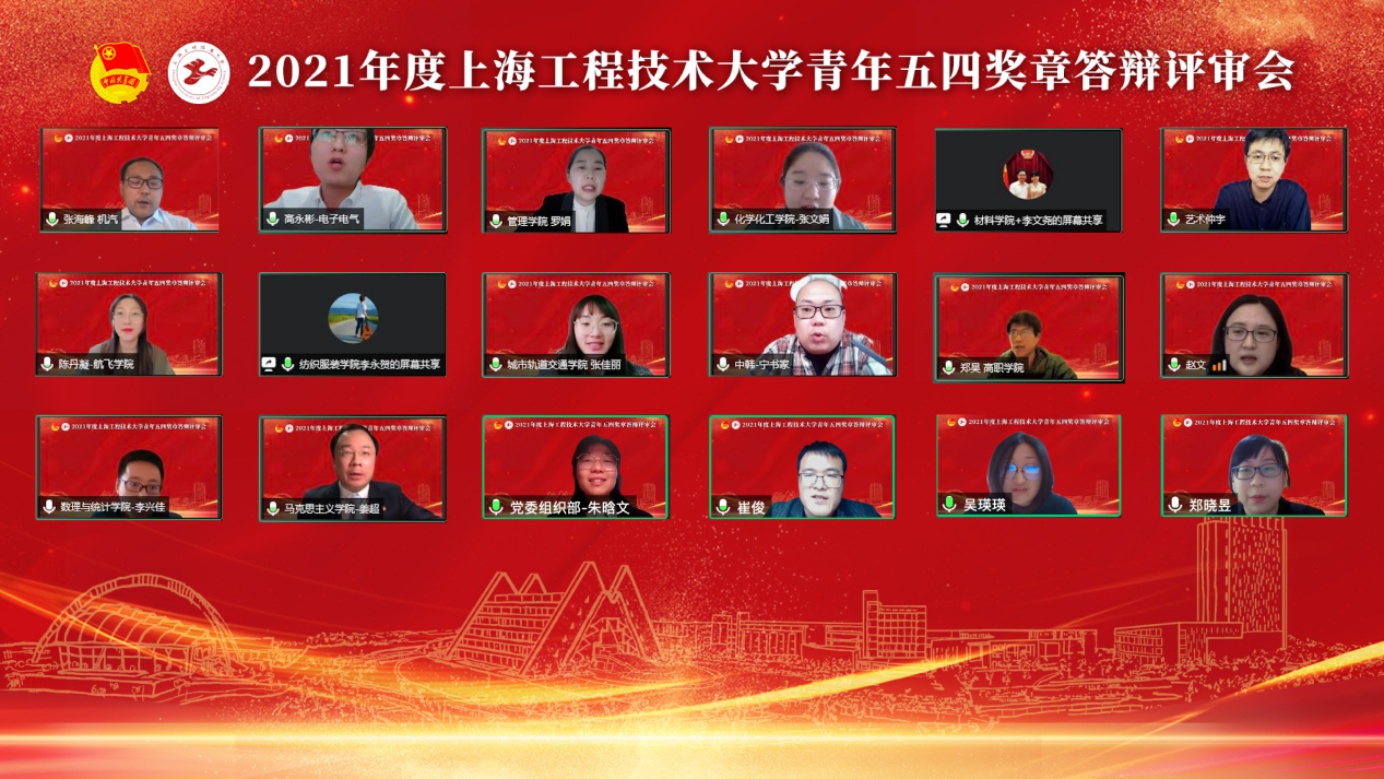 4月18日下午,2021年度上海工程技术大学青年五四奖章答辩评审会在线召开。校党委常委、组织部部长朱洪春,宣传部副部长祝玥,教师工作部副部长孙守印,研究生工作部副部长李扬,上海第二工业大学团委书记董凌莉,上海立信会计金融学院团委书记魏康婧,校团委委员、各学院团委书记、副书记、组织部部长和团员青年代表们共100余人出席本次会议。会议由校团委书记董旖旎主持。