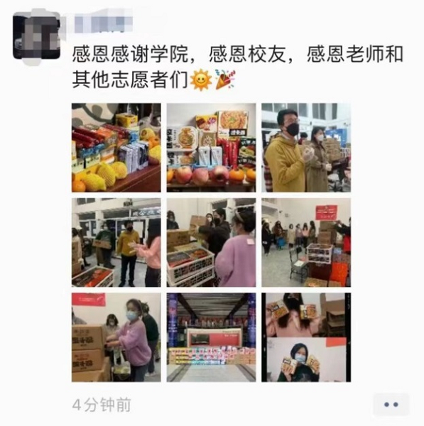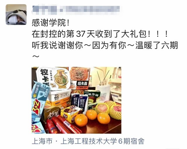17日19时,艺术设计学院党委书记袁蓉、副书记刘江和辅导员、志愿者一行,来到六期19号、30号楼,把应世超沉甸甸的爱心物资送到同学们的手上。同学们看到学院领导,拿到爱心物资,纷纷表示感谢学院,感谢校友,一定继续坚守,夺取全面社会面清零和疫情防控的最终胜利。