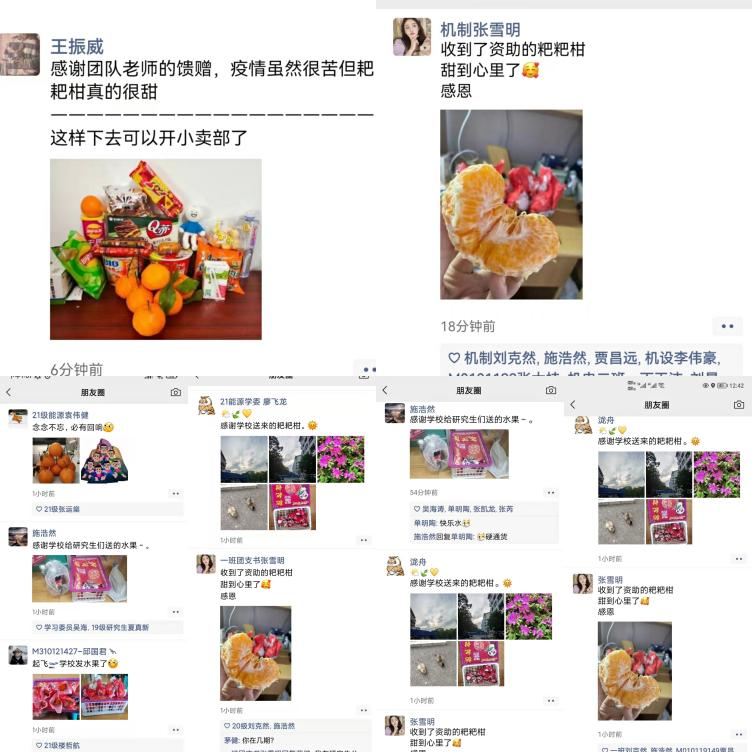 学生们拿到爱心物资后纷纷在朋友圈凡尔赛起来,“感谢学院!疫情虽然很苦,但耙耙柑真的很甜”“这一波是我们学院赢了”“这耙耙柑甜到了心里”。机械与汽车工程学院的大家庭中,老师们还在不断地用实际行动为学生排忧解难。