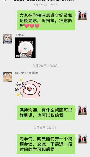 通过交流分享,学生反馈线上上课、考试、毕设等都进展顺利,学习条件有保障,但是生活上遇到一些不便,团队老师对学生的问题进行了汇总和反馈,同时在交流中对学生能够遵守学校防疫规范要求,为学校的防疫工作做出的巨大贡献表示感谢。嘱咐学生不要焦虑和慌张,遇到问题及时联系辅导员或学业导师,多渠道交流,大家互帮互助,共度难关。