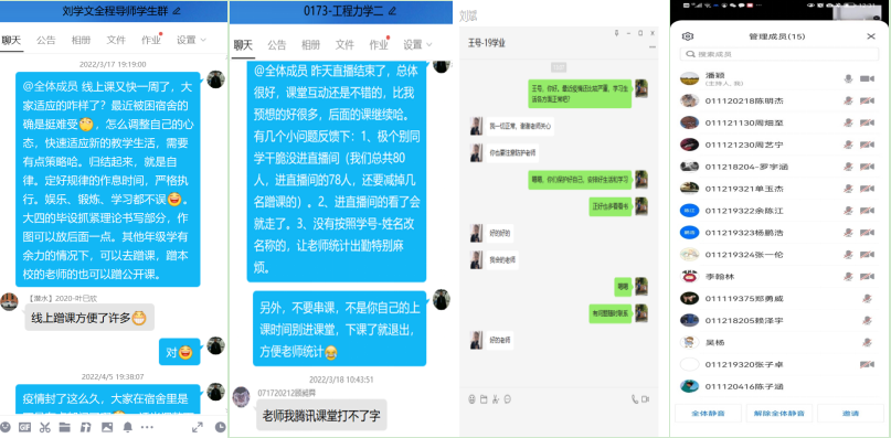 教学上,每位专任教师尽心尽责开展网课,网课前先点名,督促学生按时上课,上课中及时观察讨论区和聊天区学生的动态,不定期点名提问,开麦回答问题,提高学生课堂的参与率。研究生导师每周开展组会,修改研究生论文,督促研究生按时间节点完成科研任务。