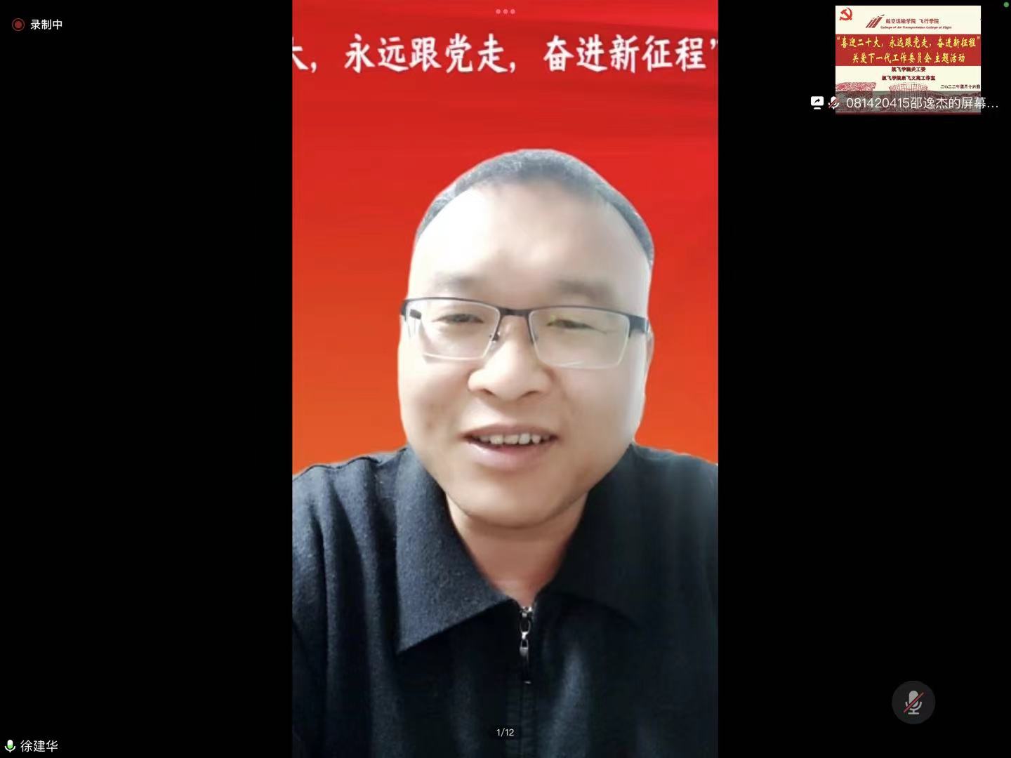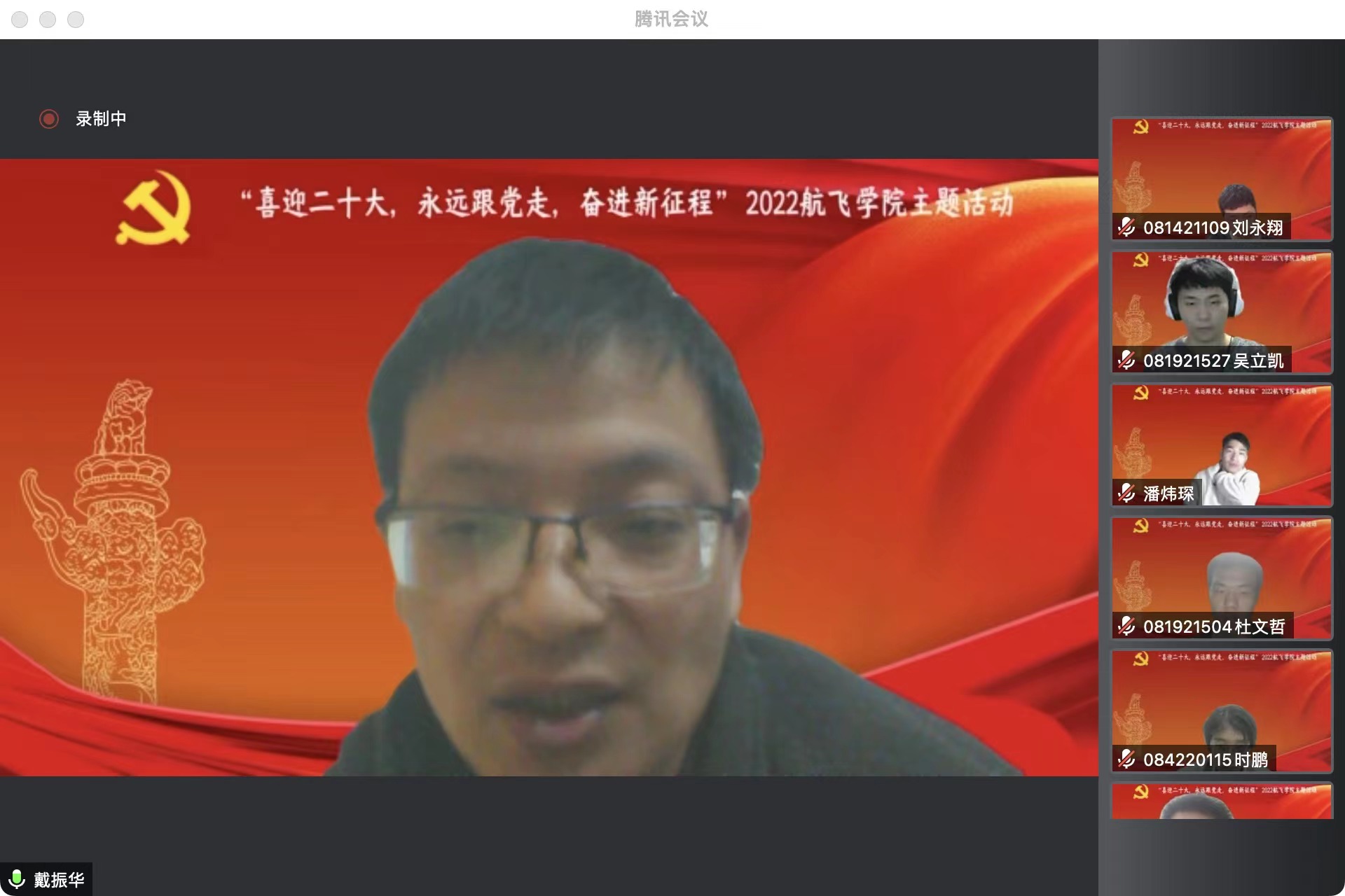 第一场活动是学院关工委委员与在校学生开展交流分享会。会议于4月16日晚通过腾讯平台举行。会议邀请到航飞学院关工委资深委员、航飞学院原党总支书记罗忆儿老师出席。航飞学院党委书记、关工委主任徐建华,副书记、关工委委员戴振华,组织员邱峰,学生办公室主任、学生第四党支部书记陈丹凝,学院团委书记、学生创新团队党支部书记李茜希,学生第一党支部书记赵晓艺,以及部分学生党员、团员青年代表参会。